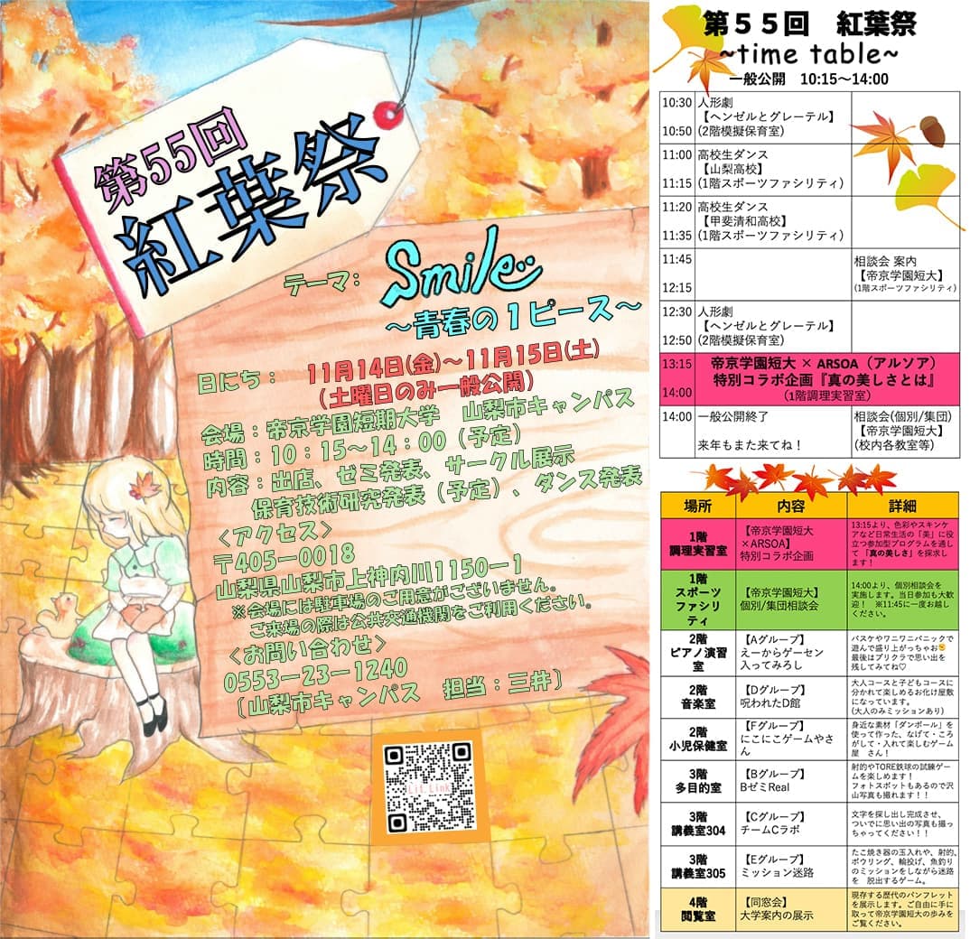保育科らしい展示や発表、ダンス、フードの出店等盛りだくさんの紅葉祭(学園祭)へどうぞ! 同日開催するオープンキャンパスにもぜひご参加ください。来年度の授業に関連し「真の美しさとは」をテーマに色彩やスキンケアなど日常生活の「美」に役立つ参加型プログラムを実施👏
